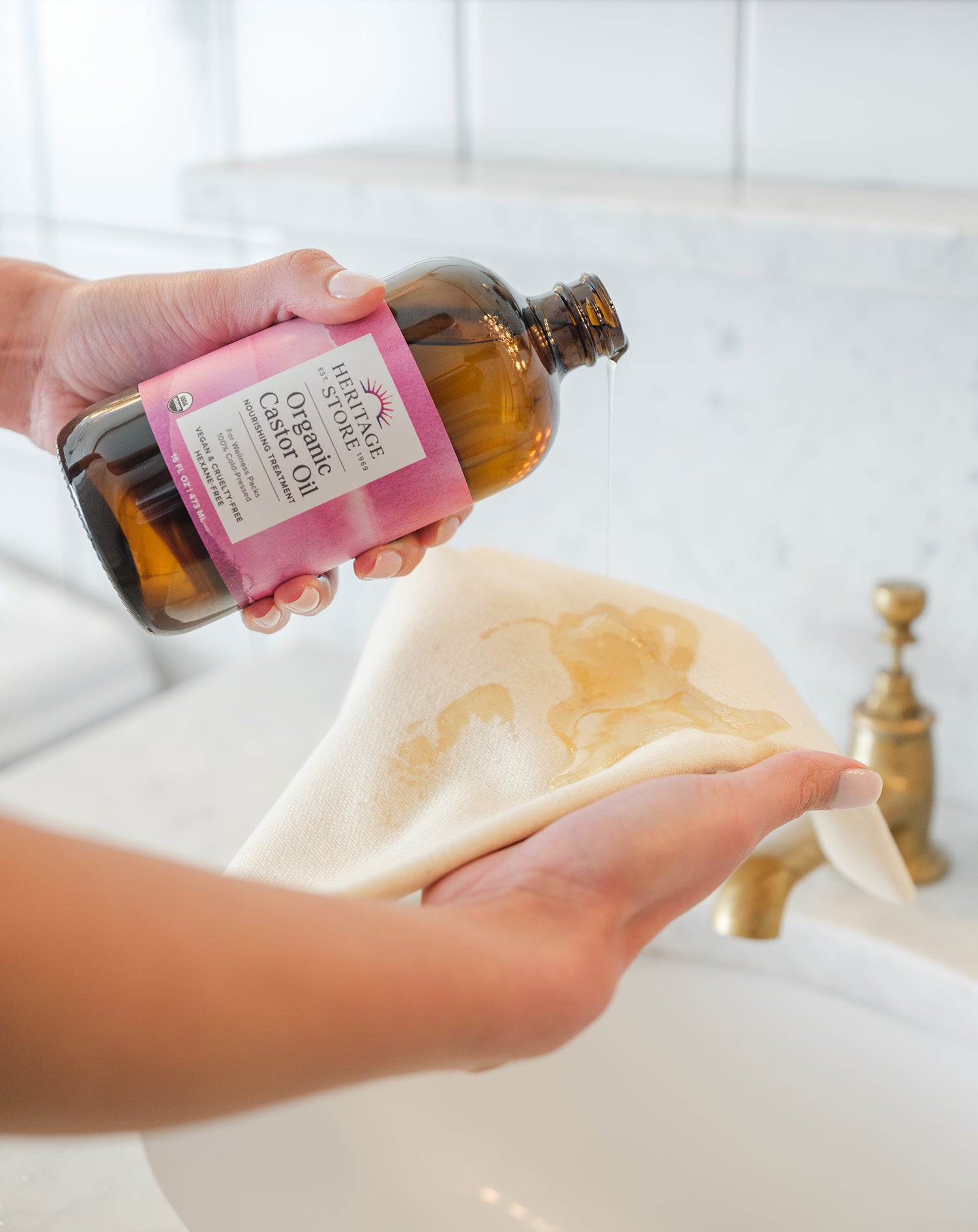 1. Fold at least once to make a pack sized for desired application and saturate with castor oil. Oil may be preheated or used with a heating pad or hot water bottle.
